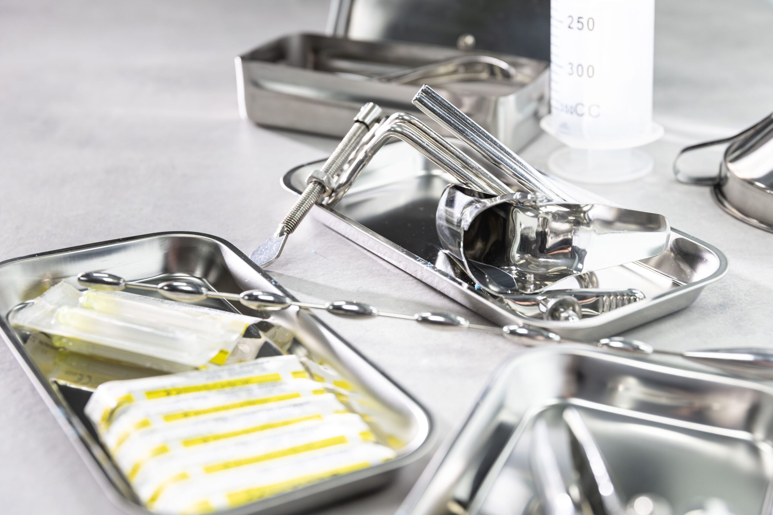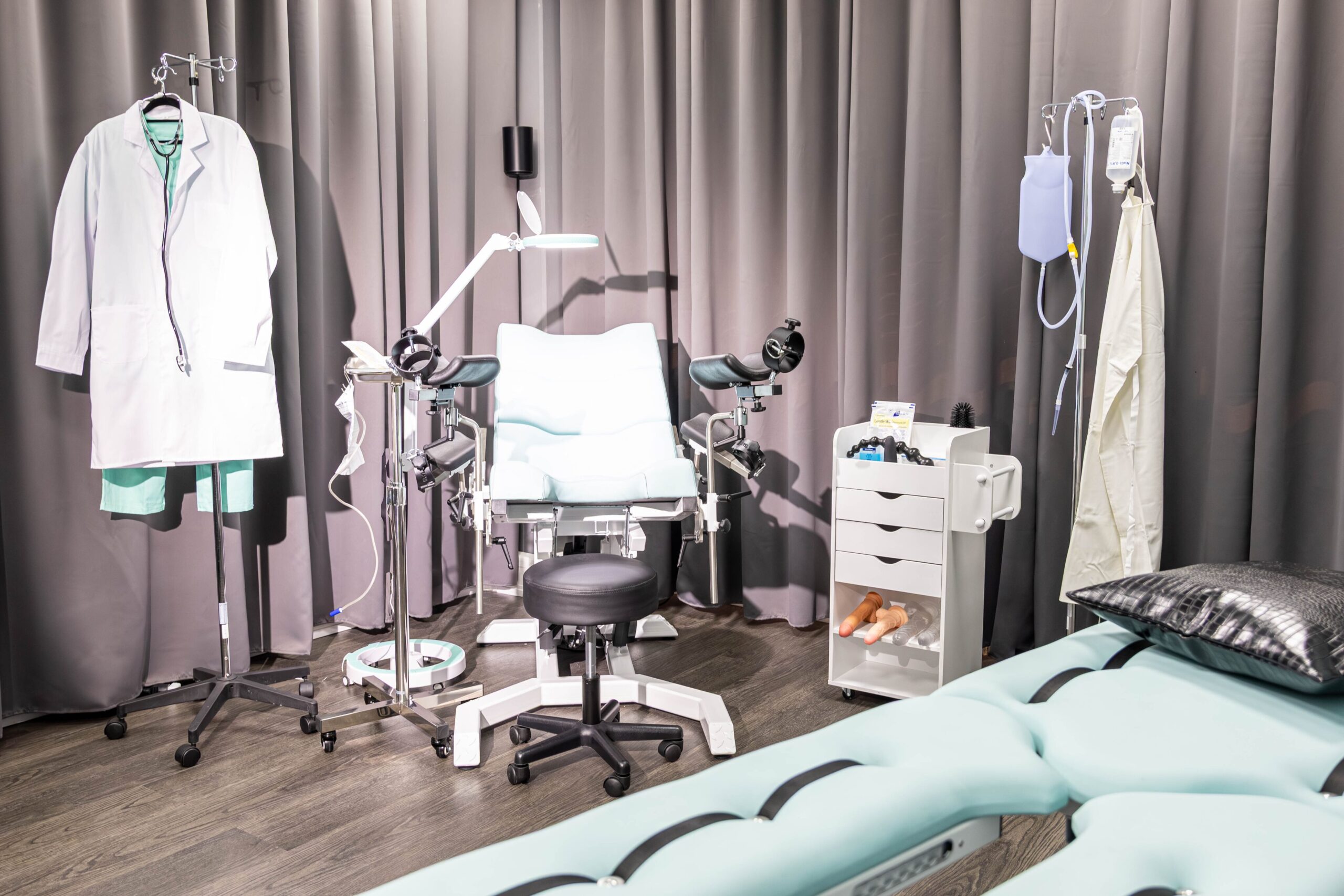 Eine sterile Klinik mit glänzenden Instrumenten, perfekt ausgeleuchtet für das Spiel mit Vertrauen und Hingabe.